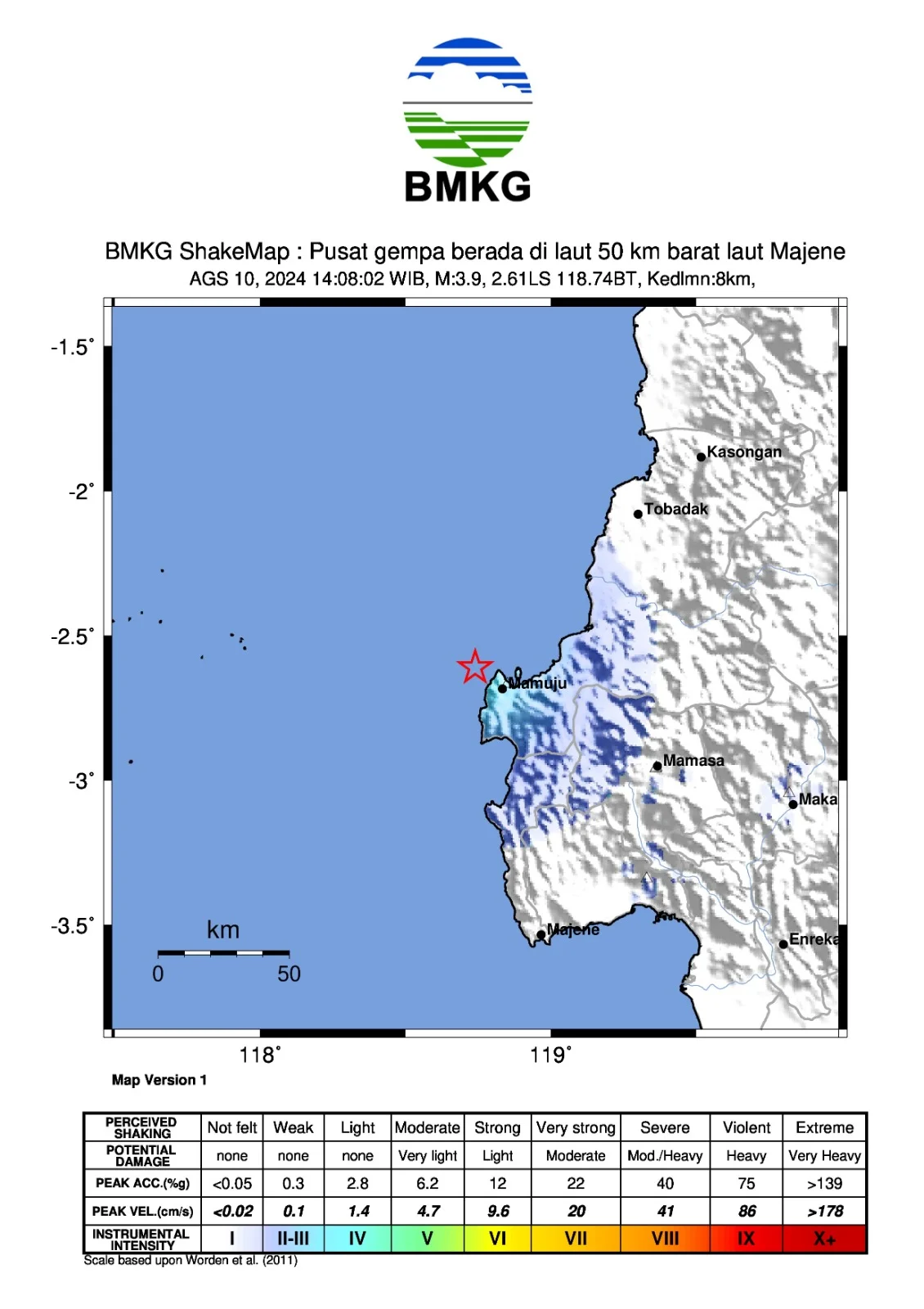 Sulbarpos.com, Mamuju – Kabupaten Mamuju, Provinsi Sulawesi Barat, diguncang gempabumi tektonik pada Sabtu, 10 Agustus 2024, pukul 15:08 WITA.