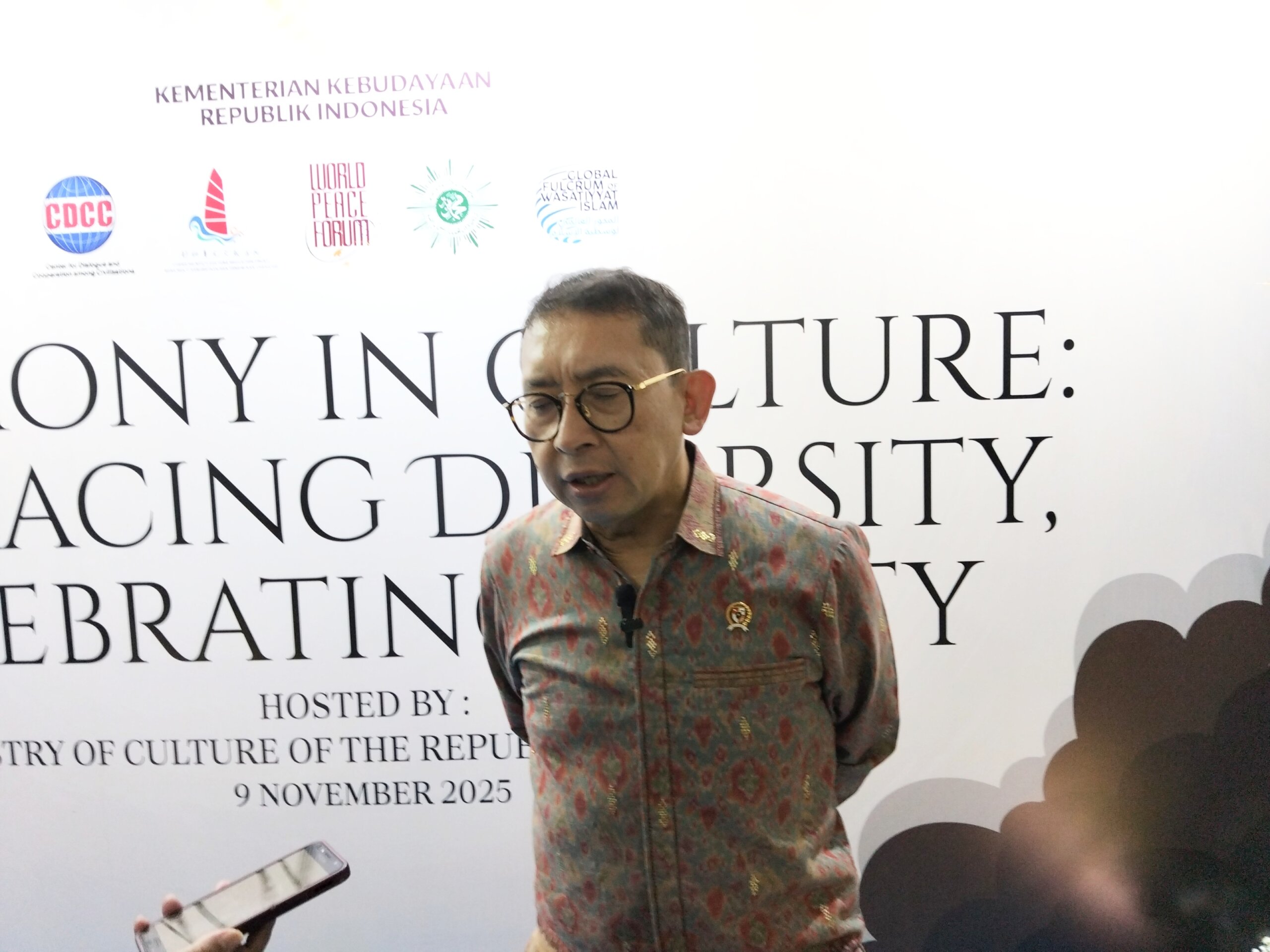“Forum seperti yang dilaksanakan hari ini sangat penting karena ini adalah multifunction dengan latarbelakang yang berbeda-beda, agama yang berbeda-beda dan melakukan sebuah percakapan terkait perdamaian dunia. Tentu saja, ini sejalan dengan misi kebudayaan kita, kebudayaan ini adalah bahasa utama dalam perdamaian,” tutur Fadli Zon.