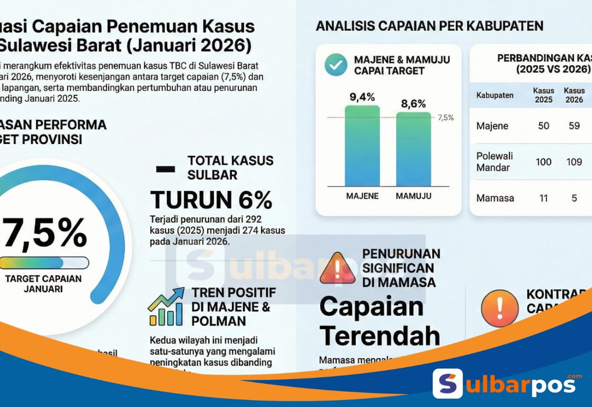 Berdasarkan capaian penemuan kasus TBC bulan Januari Tahun 2026, Sulbar mencatat total 274 kasus. Capaian ini menjadi gambaran awal kinerja deteksi dan penanganan TBC di enam kabupaten se-Sulbar pada awal tahun 2026.