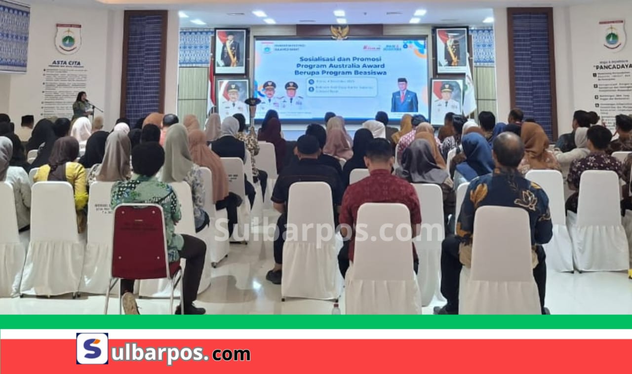 Sulbarpos.com, MAMUJU – Asisten Pemerintahan dan Kesejahteraan Rakyat (Kesra) Setda Provinsi Sulawesi Barat (Sulbar), Muhammad Jaun, mewakili Gubernur Sulbar, Suhardi Duka, menghadiri kegiatan sosialisasi dan promosi program beasiswa Australia Awards Indonesia (AAI) yang digelar di Mamuju, Kamis, 4 Desember 2025.